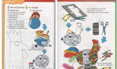 Gerade jetzt, wenn Ostern vor der Tür steht, können die Kinder einen kunterbunten Osterhahn aus einem Luftballon, einer leeren Klopapierrolle und vielen Zeitungen basteln.
