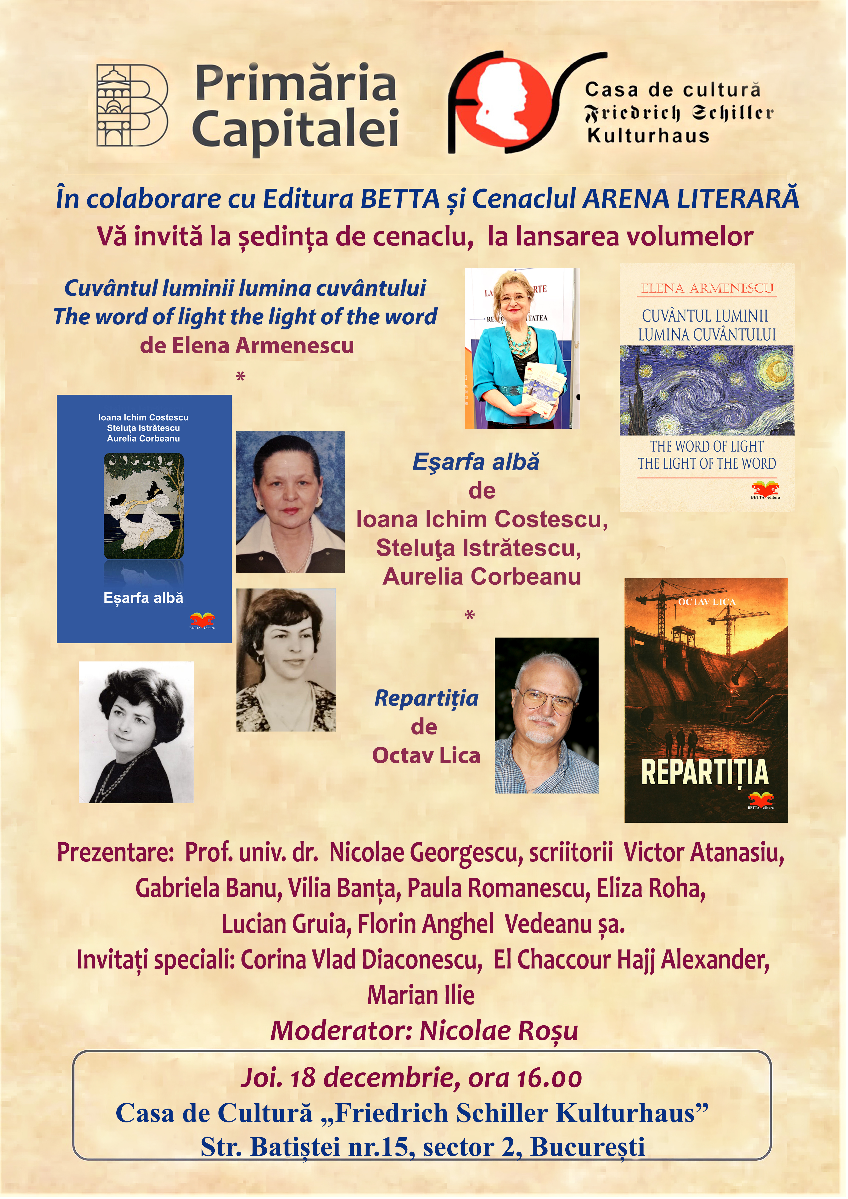 Citește mai mult... Lansare multiplă: Editura Betta și Cenaclul Arena Literară – „Cuvântul luminii lumina cuvantului”, „Eșarfa albă” și „Repartiția”
